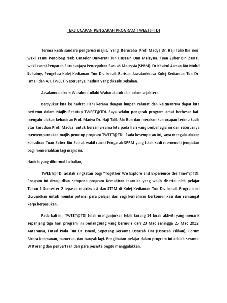 Contoh Ucapan Pengarah Program